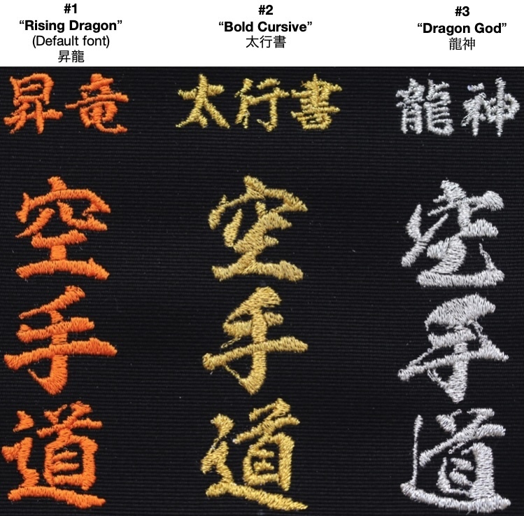 In TOKAIDO’s continuing commitment to quality and customer service we have decided to add 3 font options for our black belt embroidery. Below from left to right we are offering: